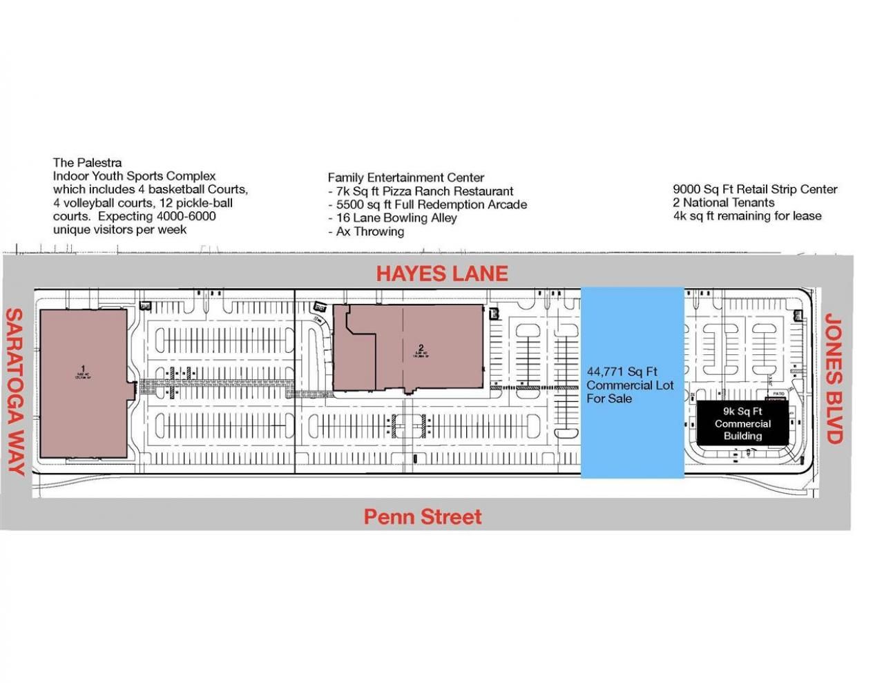 Only lot left in Solomons Entertainment District. This 1.03 acre lot sits between a new 9000 sq ft strip center with 2 national tenants to the East and to the West, a Family Entertainment Bowling Center "BowlDogs" with 16 lanes of bowling, Ax throwing, a new 6,000 sq.ft. Pizza Ranch, 5,400 sq.ft. family arcade, and further to the West is the new indoor sports facility called "The Palestra". The Palestra features 4 indoor basketball courts, 4 indoor volleyball courts, and 12 pickle-ball courts with 4,000-6,000 unique visitors per week expected. 400 Class A apartments are being built directly to the north within walking distance, along with 119 single family homes and 50 zero-lots. High exposure to in-town traffic on Penn St & N. Jones Blvd. and next to attractions that will bring 6,000-9,000 unique visitors to your parking lot every week. If you want eyeballs on your business, this is the site! Build to suit, design build, and land leases are all options. Site allows for ample stacking. Pad ready with detention allocated inside regional detention pond. Regional bike trail connects to the property. Owner is a licensed real estate agent in the state of Iowa.