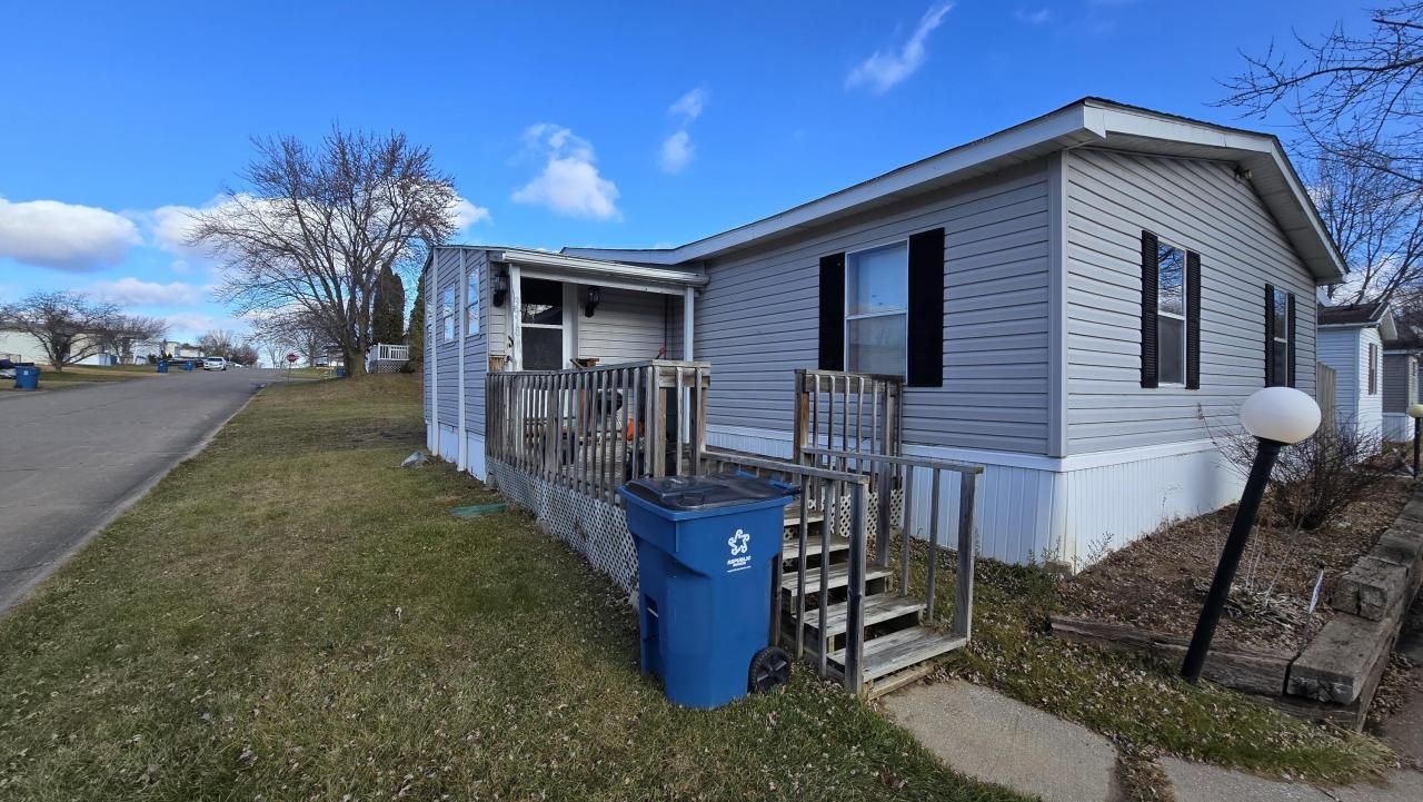 Double-wide 3 bed 2 bath mobile home on leased land. Updates include new furnace and ducts, water heater, heat tape, floor insulation in November 2023. Fenced in yard, detached one car garage, enclosed porch sitting on a corner lot. Located in Wood Dale Mobile Home Park. Cash purchase only.