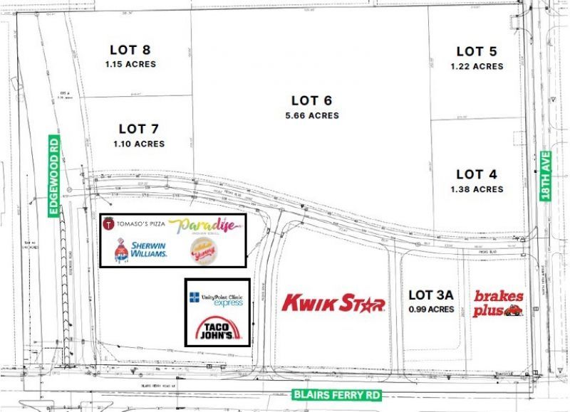 Pecks Landing is an 18-Acre master-planned retail power center near HyVee Grocery Store, Kwik Star, Brakes Plus, a 200,000 SF Fleet Farm and many national retail cotenants. Located on the high traffic corner of Edgewood Road NE and Blairs Ferry Road in close proximity to Highway 100/Collins Road Extension and I-380. Daily traffic counts currently exceed 24,200 along Edgewood Road and 20,200 along Blairs Ferry Road.