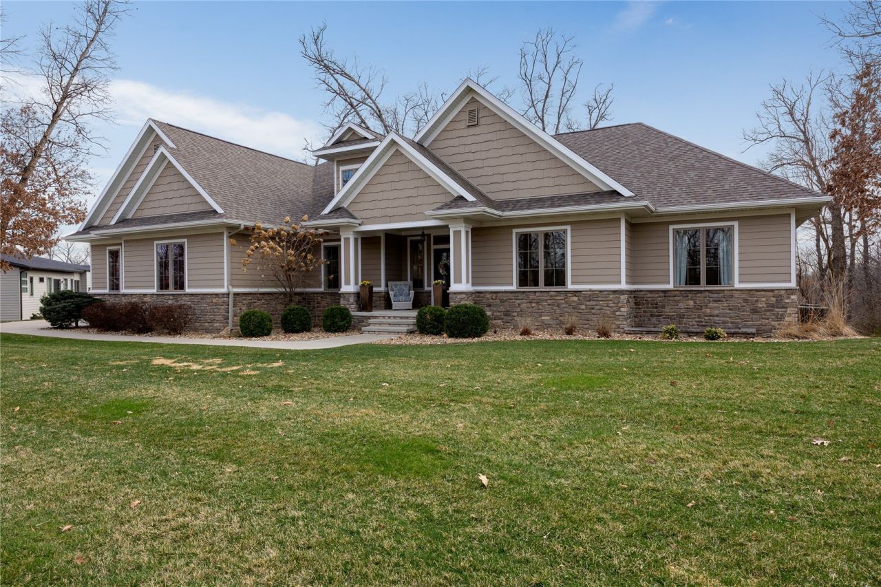 Built in 2014 and set on a private 0.719-acre wooded lot, this luxury ranch home in the exclusive Keystone on Lakeside neighborhood on the SE side of Cedar Rapids delivers the perfect blend of upscale design, space, and privacy. With over 4,800 square feet, this 6-bedroom (3 on main level and 3 in lower level), 3 full bath, 2 half bath home features LP Smart siding with partial stone exterior, a 3-stall garage with additional concrete parking, and a 5-year-old roof, offering both style and peace of mind. Inside, soaring vaulted ceilings with natural wood beams, hardwood flooring throughout most of the home, and tons of natural light from expansive windows create a warm yet dramatic first impression. The open-concept kitchen and great room showcase granite countertops with 2-tiered island with breakfast bar and a formal dining room. Two gas fireplaces with stone hearths create warmth to the great and rec rooms. Dedicated den/study office on main level. The primary en suite is a true retreat with a custom tiled shower, dual vanities with granite counter tops, private water closet and custom walk-in closet. The walk-out lower level expands entertaining potential with three additional bedrooms, a private theater room, and a heated bar area with in-floor heating, each lower-level bedroom and the theater room equipped with individual electric heat and thermostats. Outdoor living is unmatched with a 3-season porch, deck, patio, hot tub, and formal fire pit, all surrounded by mature trees for exceptional privacy. Enhanced by a security system, whole-home sound system, and irrigation, this high-end Cedar Rapids home for sale is a rare opportunity to own a luxury ranch with walk-out basement, premium finishes, and resort-style amenities in one of the area's most sought-after neighborhoods.